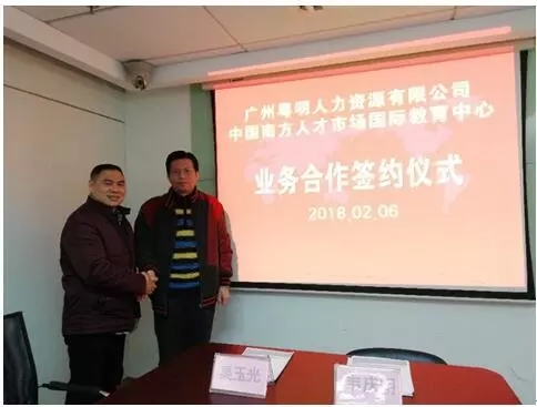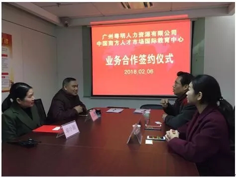 2018年2月6日上午,中国广州人才集团国际教育中心与广州粤明人力资源有限公司合作协议签约仪式在宜安广场5楼505会议室举行, 双方将携手构建“人力资源+国际教育”新生态。充分发挥各自优势,提升互动效能、改善客户体验,推进传统服务业转型升级,更好地普惠民生,服务人才。