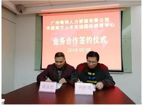 中国广州人才集团国际教育中心副总经理吴玉光与广州粤明人力资源有限公司总监韦庆明分别代表双方企业签订了合作协议,签约仪式在和谐融洽的氛围中圆满结束。