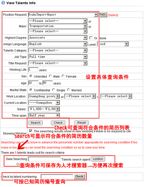 ”按钮,可以让您预先知道符合条件的人才数量,如果太多或者太少,可以对查询条件重新设置,以节省您宝贵的时间。