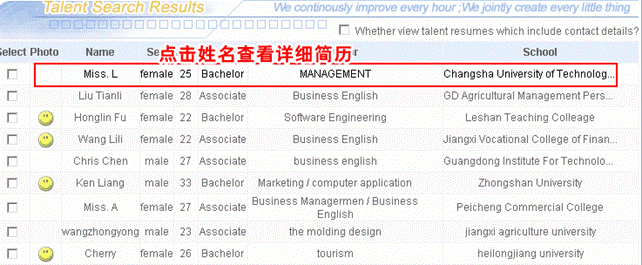 点击求职者姓名,查看简历具体内容;对感兴趣的简历可点击下方 “