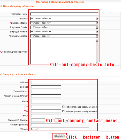 Go to ¡®Recruiting Enterprises Member Register¡¯ page, and fill detailed company info and contact means£¬and then click ¡®
